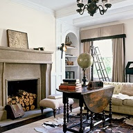 Ah, still the antique daybed, painting, and a fireplace aglow. Is that a clementine tree I spy?